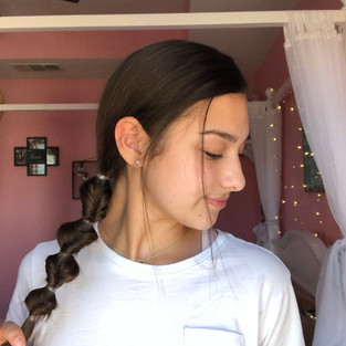 The second hairstyle is a twist braid! This is super simple for the summer but the twist adds a lot of flair to make it unique. Start by simply parting your hair wherever you usually part it. I part my hair on the left but whatever you like will work! Once you have your hair parted, take it to the right side of your head and create a side ponytail securing it with a clear elastic. Now that you have a side ponytail simply go about an inch down and tie it with a clear elastic. This style is similar to the first but when you have that one inch section secured pull the section apart and flip the rest of the hair through and if it has a strange hole in it push the elastic up to close it. Repeat that step until you've reached the end of your hair. Now pull on your sections to make it look bigger and add a more messy look to it!